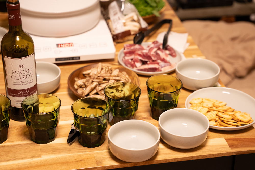 今回、鴨鍋用のお鍋はオプション(550円)で付けてもらいましたが、お鍋用の取り皿やコップ、平皿、割りばしなど忘年会で使ったものは全て常設で付いていたものでした。食器や調理器具を持っていくのは大きなストレスになるので、とてもありがたいサービスですね。