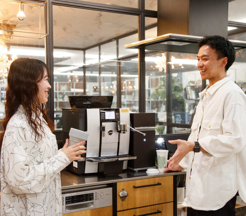 「友安製作所に入社してから、コーヒーの味にうるさくなった」という声が、アンケートでも多く寄せられました。オフィスの中心には本格的なコーヒーマシンが設置されており、こだわりの豆で抽出した一杯がいつでも飲み放題という環境が、多くの社員を「コーヒー好き」に変えています。